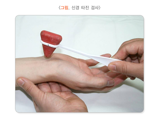 정중 신경이 지나는 부위를 두드릴 때 손가락이 저리면 수근굴 증후군을 의심합니다.