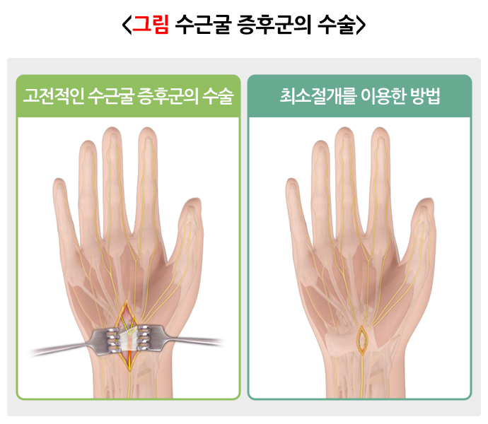 수근굴 증후군의 수술적 치료는 손바닥을 절개하고 가로 손목 인대를 잘라 정중신경 압박을 풀어주는 것입니다. 국소마취, 부위마취 혹은 전신마취가 필요합니다. 과거에는 손목에 큰 절개선을 넣어 손목과 손바닥에 흉터가 크게 생기고 통증도 심했으나, 최근에는 최소 절개법으로 2~3 cm 정도의 흉터만 생기므로 외관상으로도 우수한 결과를 얻고 있습니다.
