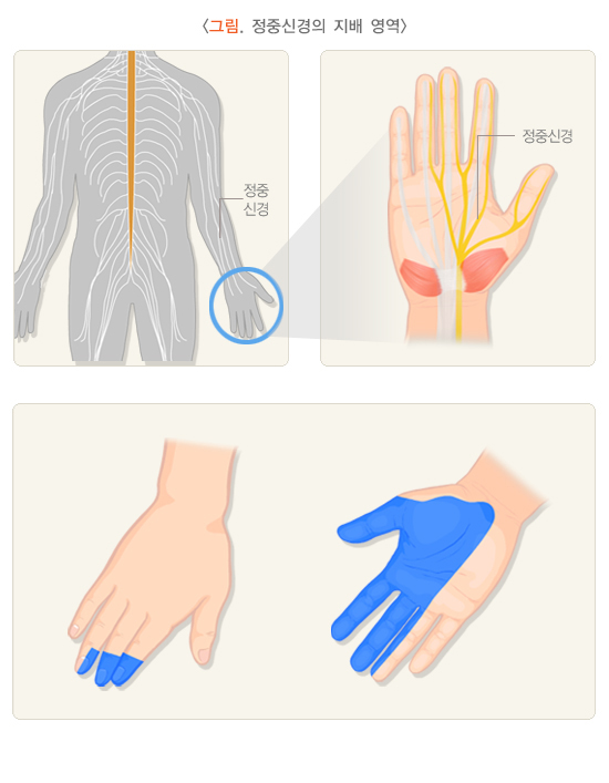환자들은 흔히 손 전체가 저리다고 하지만, 자세히 진찰해보면 손등 및 새끼손가락, 넷째 손가락의 새끼손가락 쪽 절반의 감각은 정상입니다. 반면 엄지손가락, 둘째 손가락, 셋째 손가락, 넷째 손가락의 엄지쪽 절반과 그 아래 손바닥 피부의 감각은 둔합니다. 진행된 경우에는 엄지 두덩(무지구)의 근육이 위축되어 납작해집니다.