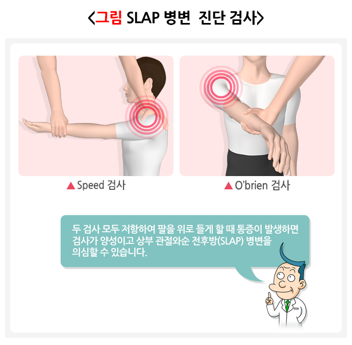 SLAP 병변을 진단하려면 어깨관절을 신전하고 팔을 굴곡 및 외회전한 상태에서 저항을 이기고 전방 거상 시 통증의 유무를 보는 Speed 검사, 어깨관절에 축성 압박(axial loading)을 가하며 회전시킬 때 통증이나 기계적 마찰 유무를 보는 압박 회전 검사(compression rotation test), 엄지손가락을 바닥으로 향하게 한 후 하방으로 가해지는 힘에 저항하게 해 통증의 유무를 보는 O’Brien 검사를 시행합니다.