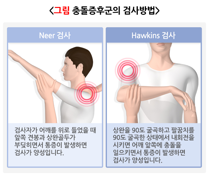 어깨 통증이 있을 때 운동범위를 검사하고, 근력, 통증을 유발하는 충돌 검사(Neer, Hawkin’s 검사)를 시행해 진단할 수 있습니다.