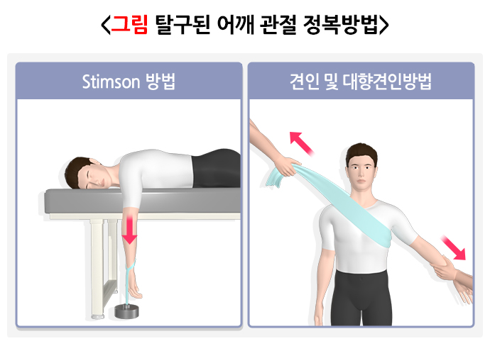 겨드랑이 신경이 어깨관절이 탈구된 주변을 지나가므로 의료진이 아니면 정복을 시도하지 않는 것이 좋습니다. 정복을 잘못 시도했다가 신경 마비가 발생할 수 있기 때문입니다. 자꾸 재발하는 경우는 본인이 직접 정복할 수도 있지만, 타인이 과도한 힘을 이용해 정복하는 것은 금물입니다.