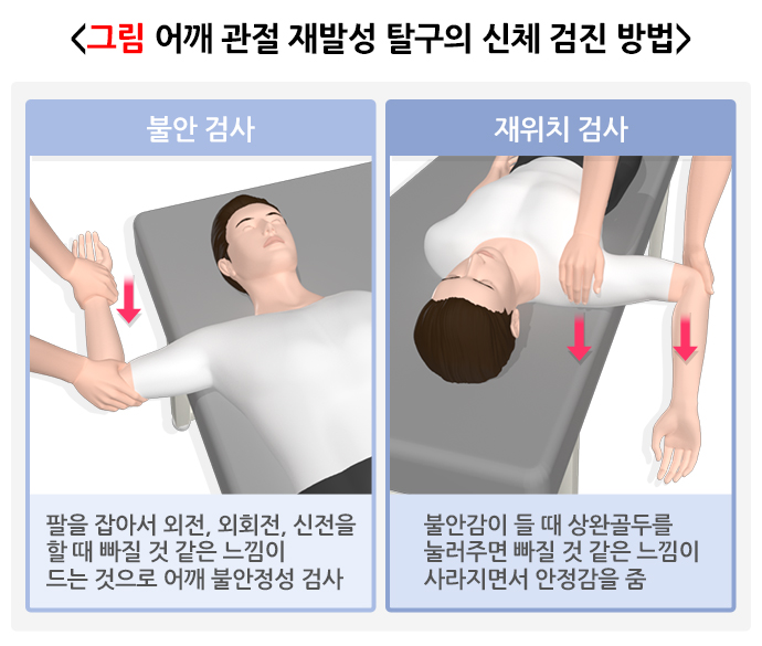어깨관절 재발성 탈구의 신체 검진 시에는 상지를 외전, 외회전 및 신전할 때 빠질 것 같은 느낌을 호소하는 불안 검사(apprehension test), 이때 상완골두를 후방으로 누르면 불안감이 해소되는 재위치 검사(relocation test) 등을 이용해 견관절 불안정성을 검사합니다.
