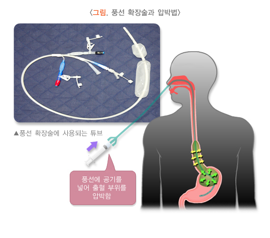 정맥류 출혈의 예방에는 사용하지 않고 급성 출혈 시에만 사용하는데, 대개 내시경으로 지혈이 되지 않는 심한 출혈 혹은 환자가 내시경을 할 수 없는 상황인 경우 시행합니다. 이 방법은 식도 내에서 풍선을 부풀려 정맥류를 직접 압박하여 지혈시키는 방법으로 90% 이상에서 효과가 있지만 식도 천공, 흡인성 폐렴 등의 심한 합병증을 유발할 수 있습니다.