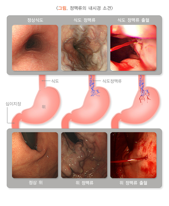 정맥류 자체는, 출혈이 없다면 증상이 전혀 없습니다. 그러나 일단 출혈이 생기면 토혈(피를 토하는 증상), 갑작스러운 어지러움, 흑색변(자장면 같은 검은색의 변), 혈변, 의식 소실 등의 증상이 단독으로 혹은 동시에 나타납니다.