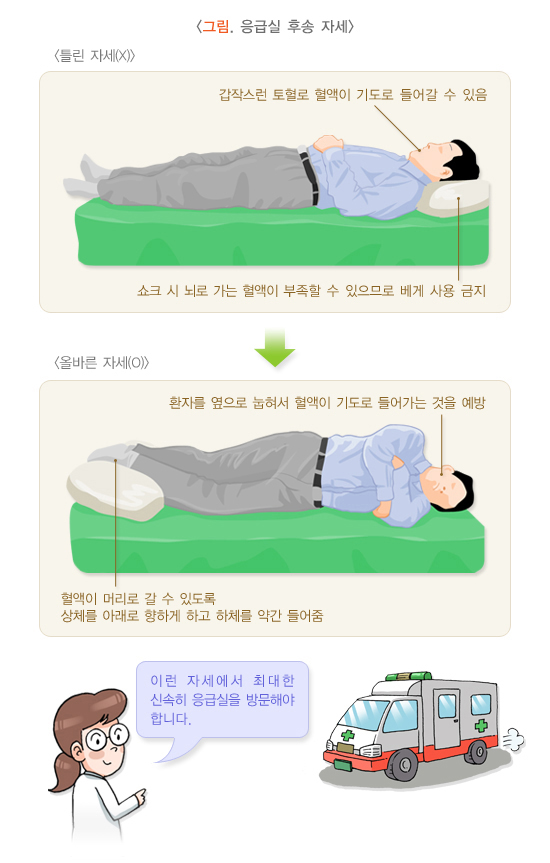 환자를 응급실로 이송할 때에는 급작스러운 토혈로 인해 피가 기도로 넘어가 숨 쉬는 것을 막는 기도 폐색이 일어날 수 있습니다. 따라서 환자를 똑바로 눕히지 말고 옆으로 눕게 하며, 혈압이 떨어지는 쇼크(shock) 상태가 발생할 수 있으으로 상체를 아래로 향하게 하고 하체를 약간 들어주는 자세로 이송해야 합니다.