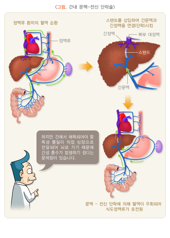 처음 출혈의 예방을 위해 시행하지는 않고, 주로 급성 출혈의 치료와 재출혈의 예방 목적으로 사용합니다. 경정맥을 통해 간문맥과 간정맥을 연결하는 관(스텐트)을 삽입하는 것으로 이렇게 하면 높아진 간문맥압이 이 관을 통해 압력이 낮은 간정맥으로 전달되어 문맥압이 낮아지게 됩니다. 그러나 이런 시술은 간에서 해독되어야 할 독성 물질이 이 관을 통해 직접 심장으로 전달되어 뇌로 전달되기 때문에 간성 혼수가 발생하기 쉽습니다. 또한 혈전으로 이 관이 자주 막혀 정맥류 출혈이 재발할 수 있다는 단점이 있습니다.