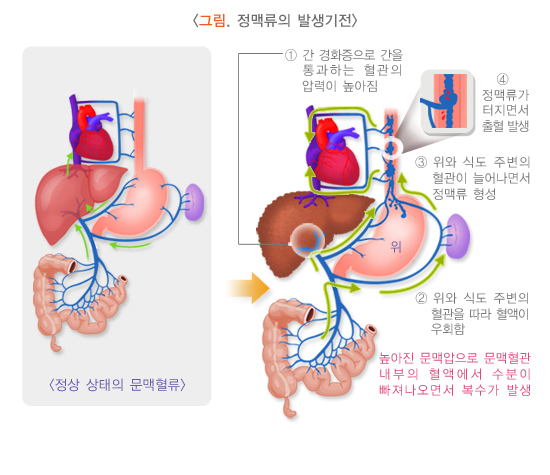 간은 많은 양의 혈액이 모이는 곳이고, 이 혈액들은 간문맥이라는 혈관을 통하여 간으로 이동합니다. 간문맥은 장에서 흡수된 많은 영양소가 혈류를 타고 이동하는 중요한 혈관 통로입니다. 그런데 간경변증이 되면 딱딱해진 간으로 혈액이 이동하기 힘들어집니다. 이로 인해 간문맥의 압력이 증가하게 되는데 이를 문맥압 항진증이라고 합니다. 간경변증에 의한 문맥압 항진증으로 인해 혈액이 더 이상 간으로 들어가지 못하고 많은 혈액이 좀 더 쉬운 길, 즉 압력이 낮은 쪽으로 길을 만들어 흘러가게 됩니다. 이렇게 해서 원래 가늘었던 혈관들이 확장되고 일부는 식도내부로 돌출되어 식도 정맥류를 형성하게 되고, 다른 일부는 위로 돌출되어 위 정맥류를 만듭니다.