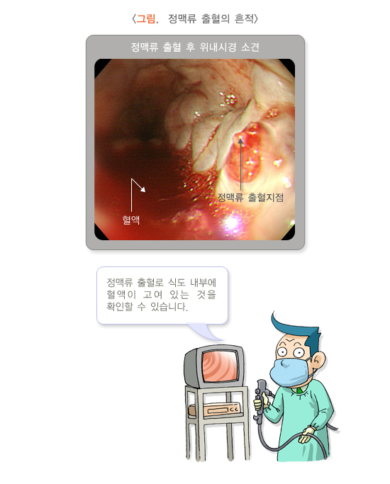 환자가 응급실에 도착하면 의료진은 먼저 혈관을 찾아 수액을 공급하고, 가능한 한 혈액도 빨리 준비합니다. 수액이나 혈액을 공급하는 이유는 정맥류 출혈이 혈압을 떨어뜨려 각종 장기에 손상을 주고, 심할 경우에는 의식까지 잃을 수 있기 때문입니다. 심한 출혈로 인해 의식을 잃으면 기관지에 관을 넣어 인공호흡을 시행하는 경우도 있습니다.