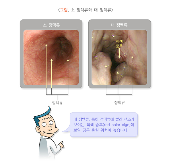정맥류는 크기에 따라 소(小), 중(中), 대(大)로 구분하기도 하지만, 중(中)과 대(大)를 묶어 대(大)로 표기하여 소 정맥류와 대 정맥류의 두 가지로 구분합니다. 소 정맥류의 경우는 출혈의 위험이 거의 없지만, 대 정맥류의 경우에는 출혈의 위험이 높습니다.