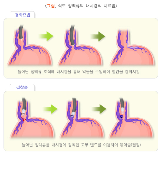 식도 정맥류에 출혈이 있으면 경화요법과 결찰술을 시행하는데, 예방 목적보다는 주로 치료 목적으로 시술합니다. 이 두 치료 방법은 모두 한 번에 끝나지 않으며, 보통 여러 차례에 걸쳐 시행됩니다. 시술 간격이나 횟수는 시술자의 경험과 선택에 달려있습니다.