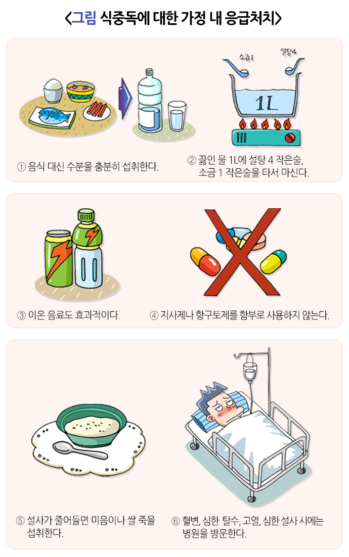 식중독 증상 중 구토는 위장 내 독소를 체외로 배출하는 반응이며, 설사는 장내 독소를 씻어내는 반응입니다. 따라서 설사 증상이 심하다고 지사제를 함부로 사용하면, 장 속에 있는 독소나 세균의 배출이 늦어 회복이 지연되고 경과가 나빠질 수 있습니다.