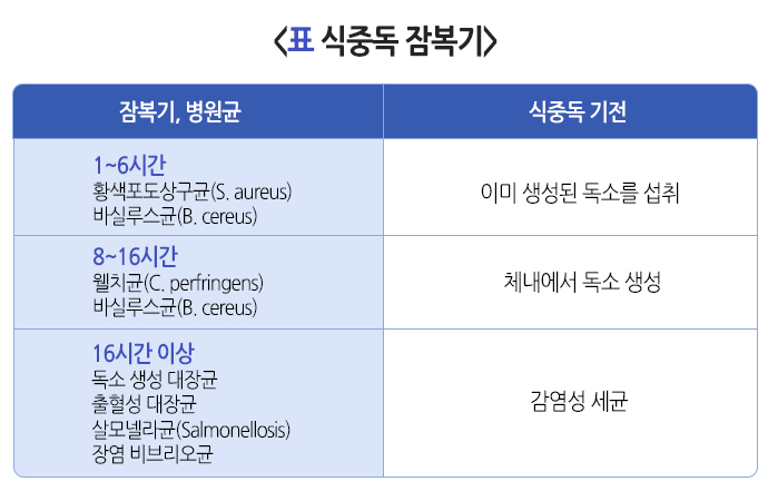 세균성 식중독은 세균의 종류에 따라 잠복기와 증상이 다양하지만, 크게 독소형과 감염형으로 구분할 수 있습니다. 세균의 독소로 오염된 음식물을 섭취한 경우는 잠복기가 1~6시간이며, 세균을 섭취한 후 체내에서 독소가 만들어지는 경우는 8~16시간, 감염성 식중독인 경우는 잠복기가 16시간 이상입니다.