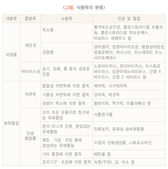 미생물에 의한 식중독은 세균성 식중독과 바이러스성 식중독으로 구분하고, 세균성 식중독은 독소형과 감염형으로 세분화됩니다.