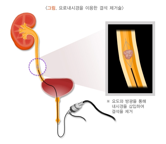 요관경을 이용한 결석 제거술은 요관에 끼어서 배출되지 않는 결석을 제거하는 방법입니다. 작은 내시경을 요도와 방광을 통해 요관에 넣은 후 내시경에 장착된 기구를 이용해서 결석을 집어내 제거합니다. 최근에는 이 내시경의 끝에 초음파나 레이저를 장착하여 결석을 일부 부서뜨린 후 제거하는 방법이 함께 사용되기도 합니다.