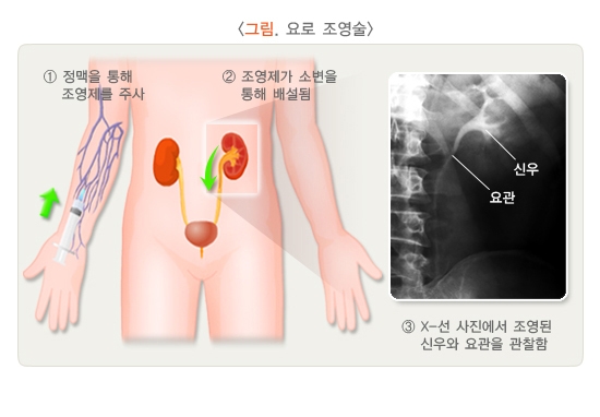 요로 조영술 검사는 정맥을 통하여 조영제라는 약물을 투여한 후 이 조영제가 콩팥으로 걸러져 요관, 방광, 요로를 통과하는 과정을 방사선 투시를 통해 확인하는 검사입니다. 요로 조영술은 신장결석의 위치를 아는 데 매우 유용하며, 만약 결석이 소변의 흐름을 막은 경우 그에 따른 비뇨기계의 변형을 알아보는 데 도움이 됩니다. 최근에는 컴퓨터단층촬영으로 대체되고 있습니다.