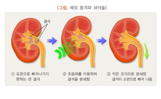 체외 충격파 쇄석술은 신장 혹은 비뇨기계 결석에 가장 흔하게 사용되는 치료로, 자연 배출이 어려울 것으로 여겨지는 결석, 특히 크기가 어느 정도 큰 결석을 초음파를 이용하여 잘게 부수어 자연적으로 배출되도록 유도하는 방법입니다. 영상학적 방법으로 결석의 위치를 확인한 후, 몸 밖에서 충격파를 발사하면 결석을 잘게 부술 수 있습니다. 시술이 끝난 후 환자들에 따라서는 수 주에 걸쳐서 결석 조각들이 배출되기도 합니다. 이 시술의 합병증으로 일시적으로 소변에 피가 섞여 나올 수 있으며, 콩팥이나 주위 조직에 일시적으로 출혈이 있을 수 있습니다. 또한 결석이 완전히 분쇄되지 않은 경우 이 시술을 다시 시행하거나 요로 내시경을 통하여 남은 결석을 제거해야 하는 경우도 있습니다. 이 시술을 사용할 수 없는 대상은 출혈 경향이 있거나 신동맥류가 있는 환자, 임산부 등입니다.