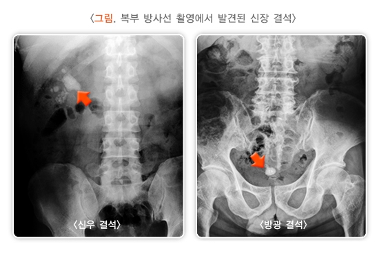 복부의 X선 사진으로 대부분(90% 이상)의 신장에 생긴 결석을 발견할 수 있으며, 신장결석의 위치와 크기를 알 수 있습니다. 그러나 일부 특정한 성분(요산 등)으로 구성된 결석은 방사선을 투과시키므로 방사선 검사로 발견되지 않을 수 있습니다.