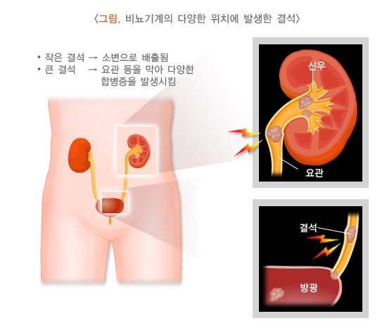 결석은 신장에서 만들어져 요관을 따라 이동하게 되며 크기가 작을 때는 소변을 통하여 저절로 우리 몸에서 빠져나가지만, 크기가 크면 이동하는 도중에 콩팥, 요관, 방광 및 요도와 같이 비뇨기계를 이루는 여러 기관에서 각종 문제를 일으킬 수 있습니다.