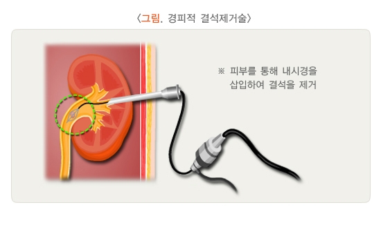 체외 충격파 쇄석술이 성공적이지 않거나 결석의 크기가 큰 경우는 수술로 환자의 등에 조그만 크기의 절개를 한 후 신장경이라는 기구를 이용하여 결석을 직접 보면서 제거합니다. 크기가 작은 결석은 그대로 꺼내고, 크기가 크면 초음파나 레이저 등으로 분쇄하여 꺼내기도 합니다. 절개의 크기가 크지 않고, 국소 마취로 시행할 수 있어 회복 기간이 빠르고 짧은 시일 내 정상 활동이 가능합니다.