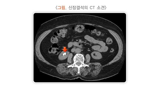 급성기의 신장결석과 비뇨기계 결석을 찾는 데 크게 도움이 되는 검사입니다. 비교적 크기가 작은 결석도 잘 찾을 수 있으며, 성분과 무관하게 촬영 기계의 해상도에 따라 일정 크기 이상의 모든 결석의 위치와 크기를 확인할 수 있습니다. 최근에는 급성 옆구리 통증이 있는 응급환자의 경우 무조영 나선 컴퓨터단층촬영을 기본적인 검사로 이용합니다. 무조영 나선 CT는 드물게 일부 종류의 결석이 발견되지 않는 경우가 있으나, 방사선 조사량이 적고 조영제를 사용하지 않아 안전하며, 촬영 시간이 짧아 신속하게 검사할 수 있는 장점이 있습니다.