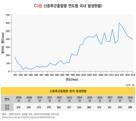 1976년 제 2종 전염병 유행성 출혈열로 지정되었고, 1983년 WHO에서는 신증후군출혈열(Hemorrhagic fever with renal syndrome, HFRS)로 명명하였으며, 2019년 개편된 법정감염병 분류체계에 제3급 감염병으로 분류되었습니다. 2000년대 들어서 발생 건수가 많이 증가되어 매년 약 400~500 감염 건수가 신고되고 있으며, 최근에는 2023년 452명, 2024년 373명이 신고되었습니다.