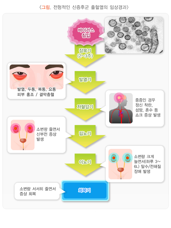한탄바이러스에 의하여 발생하는 신증후군출혈열은 고열, 출혈성 경향, 요통, 신부전이 특징적으로 나타납니다. 전형적인 임상 경과는 발열기, 저혈압기, 핍뇨기, 이뇨기, 회복기의 5단계로 나누어지는데 최근에는 저혈압기나 핍뇨기를 거치지 않고 경한 임상경과를 보이는 경우도 많습니다.