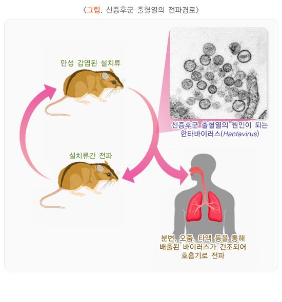 설치류가 한탄바이러스 또는 서울바이러스에 감염 된 후 분변, 소변, 타액 등을 통해 바이러스가 체외로 분비됩니다. 이후 건조된 바이러스가 먼지와 함께 공중에 떠다니다가 호흡기를 통해서나 상처난 피부, 눈, 코, 입에 직접 접촉하여 사람에게 감염되며, 사람 간에는 전염되지 않는 것을 추정됩니다. 그러므로 쥐가 많이 서식하는 야외에서 눕거나 작업을 할 때 감염의 위험이 높아 주의가 필요합니다.