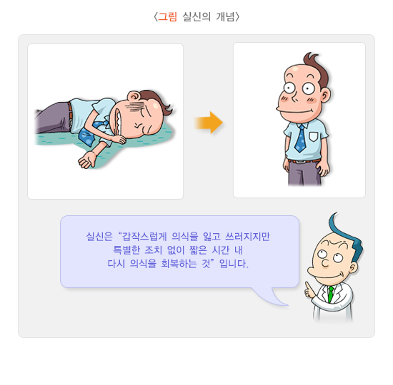 실신이라는 것은 단순히 넘어지는 것이 아니고, 정신을 잃으면서 넘어지는 현상인데, 실신과 비슷한 여러 가지 상황이 있습니다. 실신은 대개 정신을 잃고 쓰러지기 전에 어지러움, 이명, 시야가 좁아지거나 어둡게 되는 느낌이 발생합니다. 이것이 뇌에 혈액이 부족해지고 있다는 신호입니다. 하지만 쓰러지면서 머리에 충격이 있는 경우에는 직전 증상을 기억하지 못할 수 있습니다. 직전 증상이 매우 짧거나 직전 증상 없이 쓰러지는 경우도 있습니다. 또, 힘없이 쓰러지지 않고, 쓰러진 상태에서 경련이 나타나는 경우도 있습니다.