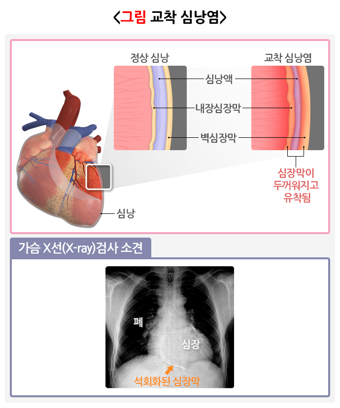 증상과 병력, 신체검사로 의심합니다. 심장 초음파검사에서 딱딱해진 심장막으로 인해 혈류가 심장으로 잘 들어가지 못해 생기는 특징적 변화들을 관찰해 진단할 수 있습니다. 컴퓨터단층촬영(CT)이나 자기공명영상(MRI) 검사, 심장에 직접 도관을 삽입해 심장 내 압력을 측정하는 심장도관삽입술을 시행하기도 하며, 원인을 찾기 위해 심장막 조직검사를 시행할 수도 있습니다. 가슴 X선 검사에서 심장막에 칼슘이 침착되어 석회화된 소견이 보이는 경우도 있습니다.