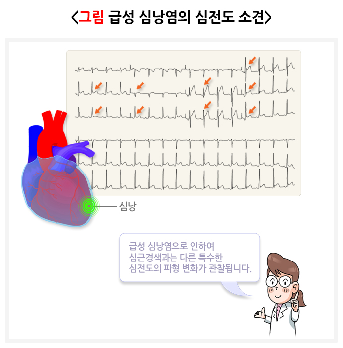 가슴통증의 양상 및 신체검사, 심전도, 심초음파 검사 등을 통해 진단합니다. 신체검사에서 가슴 청진 시 심장막이 마찰되는 소리가 들릴 수 있습니다. 심전도는 가장 중요한 진단적 검사로, 심근경색과는 다른 심근염으로 인해 특수한 파형 변화가 보일 수 있습니다. 심장초음파 검사에서는 심낭염으로 인하여 심낭 사이에 물이 차는 심낭삼출이 있는지, 있다면 양이 어느 정도인지, 심장근육의 염증인 심근염이 함께 있는지 등을 확인합니다. 이 외에도 가슴 X선 검사, 피검사, 결핵피부반응검사 등으로 원인 질환과 관련된 검사를 시행할 수 있고, 필요에 따라 심장막 조직검사나 심낭삼출액을 뽑는 검사를 하기도 합니다. 심장막의 상태를 좀 더 자세히 보기 위하여 컴퓨터단층촬영(Computed Tomography, CT)나 자기공명영상(Magnetic resonance imaging, MRI) 검사를 시행하기도 합니다.