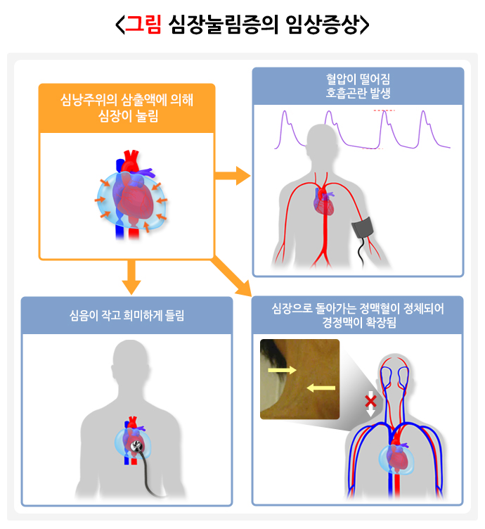 심장눌림증은 응급상황으로 심장막 안의 액체를 뽑아내는 심장막천자를 응급으로 시행하며, 경우에 따라 수술을 시행하기도 합니다. 심장막천자나 수술을 준비하는 동안 수액이나 혈압을 상승시키는 약제를 투여할 수 있습니다.