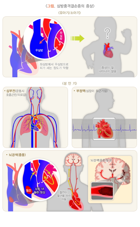 성인에서는 운동 시 호흡 곤란이나 피로감 또는 심장이 두근거리는 등 심부전이나 부정맥 소견으로 나타납니다. 상당량의 피가 새는 상황이 계속되면 점차 우심방, 우심실이 커지고 이차적으로 더 많은 피가 쉽게 우심방으로 들어가 점차 심장과 폐에 무리가 오고 증상이 악화합니다. 결국 심방중격결손 증상은 유•소아기에는 잘 나타나지 않다가 대개 청소년기 이후에 나타납니다. 성인이 되면 쉽게 피로해지고 호흡이 곤란해지는 심부전이나 부정맥이 나타나기도 하며, 더 심하면 우심실과 판막 기능의 악화 및 심장내 혈전(피떡)이 형성되고, 혈전이 구멍을 통해 좌심실로 넘어가 전신순환에 유입되면 뇌경색(중풍)의 원인이 되기도 합니다.