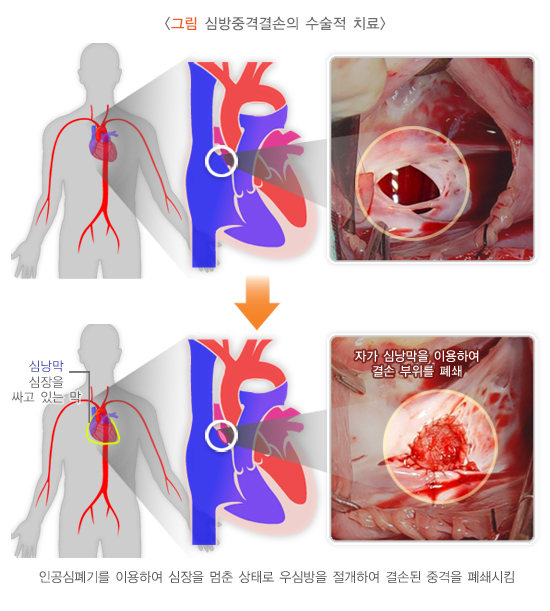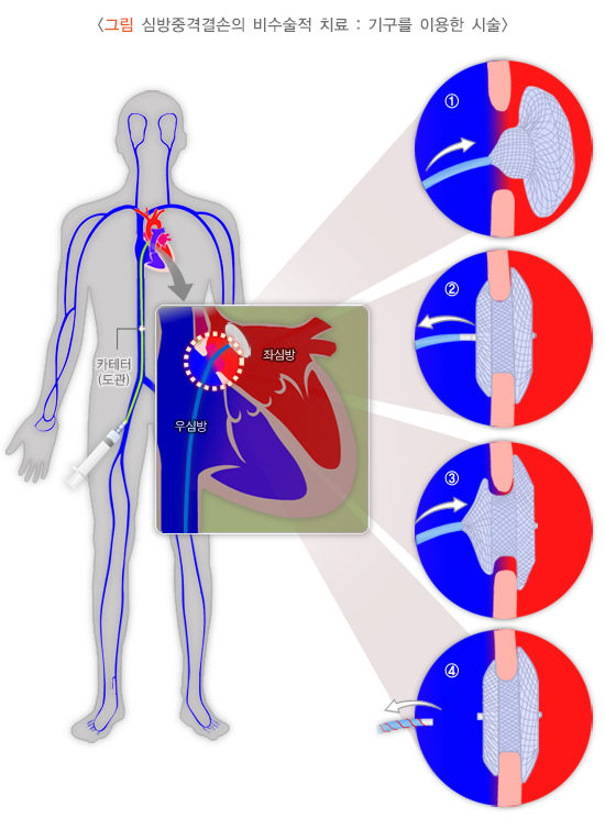 심방중격결손은 우심방과 좌심방 사이의 벽(심방중격)에 구멍이 있는 선천심장병입니다. 위치에 따라 3가지 형태로 구분하는데, 2차공 형태가 가장 흔하며 많은 경우 자연적으로 막힙니다. 대부분 어려서는 증상이 없으나, 크기가 큰 경우에는 성인이 된 후 심부전이나 부정맥 등이 발생할 수 있습니다. 증상이 있거나, 증상이 없더라도 결손을 통한 혈류가 많아 심장에 부담이 되는 경우에는 치료합니다. 기구를 이용한 시술이나 수술로 치료하며, 최근에는 가능하면 폐쇄 기구를 이용한 시술로 구멍을 막습니다.