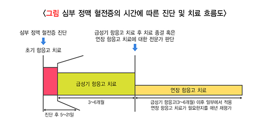 하지의 심부 정맥 혈전증이 진단되면 약 3~6개월 동안 항응고제를 사용해 피떡(혈전)을 서서히 없애는 약물 치료를 받게 됩니다. 급성기 3~6개월 간의 항응고제 복용을 하는 경우 80~90% 정도의 경우에서는 정맥 혈전증이 치료될 수 있습니다. 급성기 항응고 치료를 끝마친 이후에는 정맥 혈전증의 재발 가능성에 따라 항응고제 복용 종결할지, 6개월 이후에도 재발 방지를 위하여 항응고 지속 복용 등의 판단을 의료진이 하게 됩니다.