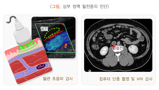 심부 정맥 혈전증의 진단은 하지의 심부 정맥을 막고 있는 혈전을 확인하는 것입니다. 비대칭적으로 부어있거나 아픈 다리의 정맥에 대한 압박 혈관 초음파 검사를 시행하거나, 정맥 조영 증강을 통한 하지 정맥의 컴퓨터 컴퓨터단층촬영(Computed Tomography, CT)을 시행할 수 있습니다.