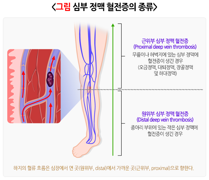 심부 정맥 혈전증은 혈전이 생긴 정맥의 위치에 따라 근위부 심부 정맥 혈전증(proximal DVT)과 원위부 심부 정맥 혈전증(distal DVT)으로 나눌 수 있습니다. 다리에서 심장으로 가는 정맥 혈류의 흐름은 발-발목-종아리-허벅지로, 심장에서 먼 쪽(원위부, distal)에서 가까운 쪽(근위부, proximal)으로 향하게 됩니다. 심장에서 가까운 근위부 정맥은 크기가 더 크고 심장에서 더 가깝기 때문에 원위부 정맥에 생긴 심부 정맥 혈전증보다 폐 색전증 등의 합병증이 더 잘 생길 수 있습니다. 하지의 깊은 정맥에 가장 흔하게 발생하지만, 팔에 있는 정맥이나 복부의 장기에 있는 내장정맥 등 드물게 다른 정맥에서 생길 수도 있습니다.