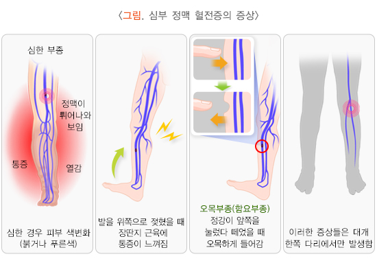 심부 정맥 혈전증은 하지의 동맥으로 공급된 혈액이 다시 심장으로 돌아오는 하지의 심부 정맥(deep vein, 하지 근육의 안쪽 깊은 곳에 있는 정맥)이 피떡(혈전)으로 막히는 질환이며, 정맥의 혈류 흐름이 발등-발목-종아리-허벅지 순서로 흐르기 때문에 피떡(혈전)으로 막힌 심부 정맥 부위 아래의 하지 부종, 통증이 발생합니다.