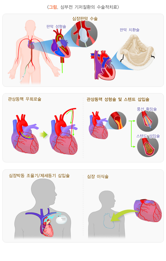 수술이 필요한 판막협착증 및 폐쇄부전증인 경우 판막 성형술이나 판막 치환술을 시행할 수 있습니다.