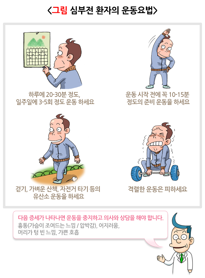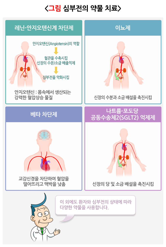 약물은 심장의 펌프 기능을 향상하고 심장에 가해지는 스트레스를 줄여 심부전 증상을 호전시킵니다. 의사가 지시한 대로 정확히 약을 복용하고, 약 부작용이 생기면 꼭 의사와 상의하십시오.