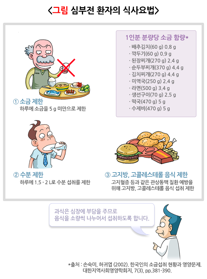 소금은 몸속에서 수분을 붙잡고 있습니다. 늘어난 수분으로 인해 심장은 더 많이 펌프질을 해야 하기 때문에 심부전 증상이 악화할 수 있습니다. 심부전 환자는 하루에 소금을 5 g 미만으로 제한합니다. 소금이 많은 음식을 피하고 싱겁게 드셔야 합니다.