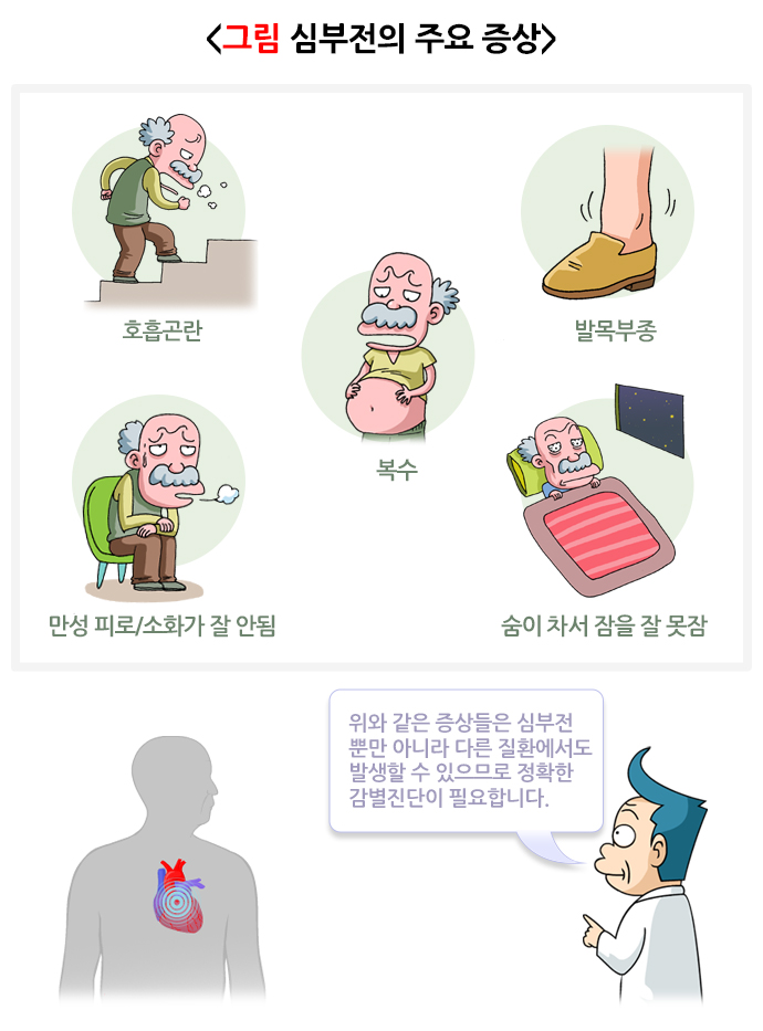 각종 심장질환으로 인해 심장에 구조적 혹은 기능적 이상이 생겨 심실의 혈액 충만 또는 박출에 이상이 발생한 상태를 심부전이라고 합니다. 좌심실의 충만 이상으로 인해 폐에 물이 차면 호흡곤란이 생기고, 좌심실 박출 장애로 인해 피로, 쇠약감이 생길 수 있습니다. 우심실의 충만 장애는 다리 부종, 복수, 흉수로 인한 호흡곤란 등의 증상을 일으킬 수 있습니다.