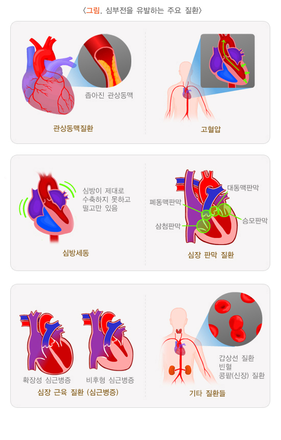 심근경색, 협심증, 폐부종, 부정맥, 관상동맥질환, 고혈압, 심방세동, 고콜레스테롤, 심부전