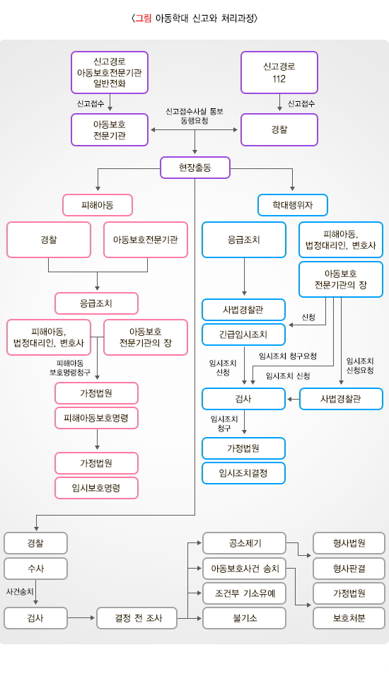 아동학대를 신고한 후에 이루어지는 관계 기관의 업무 흐름은 다음과 같습니다. 신고가 접수되면 관련 공무원과 경찰이 현장에서 아이를 만나 아동 학대 여부를 조사합니다(현장 출동). 아이에게 별도의 보호가 필요하다고 판단되면, 가해자로 의심되는 사람과 72시간 동안 분리하여 보호가 이루어집니다(응급조치). 피해 아동에게 더 오랜 기간 보호가 필요하다고 판단될 경우, 피해 아동의 법정 대리인, 변호사 또는 아동보호전문기관의 요청으로 가정 법원에서 '피해아동보호명령'을 받아 보호 시설에서 보호를 받을 수 있습니다. 한편, 가해자(학대행위자)에 대한 응급조치가 취해지면, 피해 아동과의 접촉이 금지됩니다. 가해자는 검사와 사법경찰관의 조사를 받게 되며, 필요한 경우 법적인 처벌을 받게 됩니다.