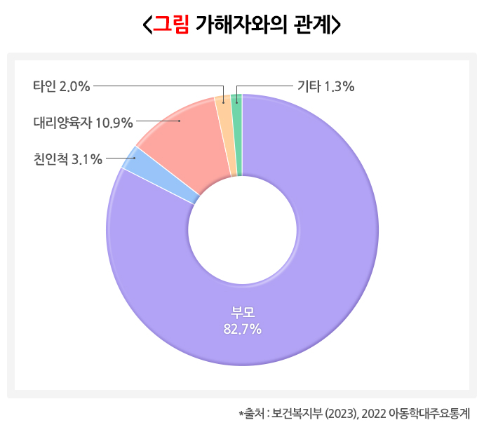 가해자(학대행위자)와 피해 아동의 관계를 살펴보면, '부모에 의한 학대'가 82.7%로 가장 높은 것을 알 수 있습니다. 이 중 친부에 의한 아동학대 사례가 45.7%, 친모는 34.2%로 높은 비율을 차지했습니다. 이렇게 부모에 의한 학대가 가장 많은 만큼, 학대의 장소도 '가정 내에서 발생'이 81.8%로 가장 흔한 것으로 알려져 있습니다.