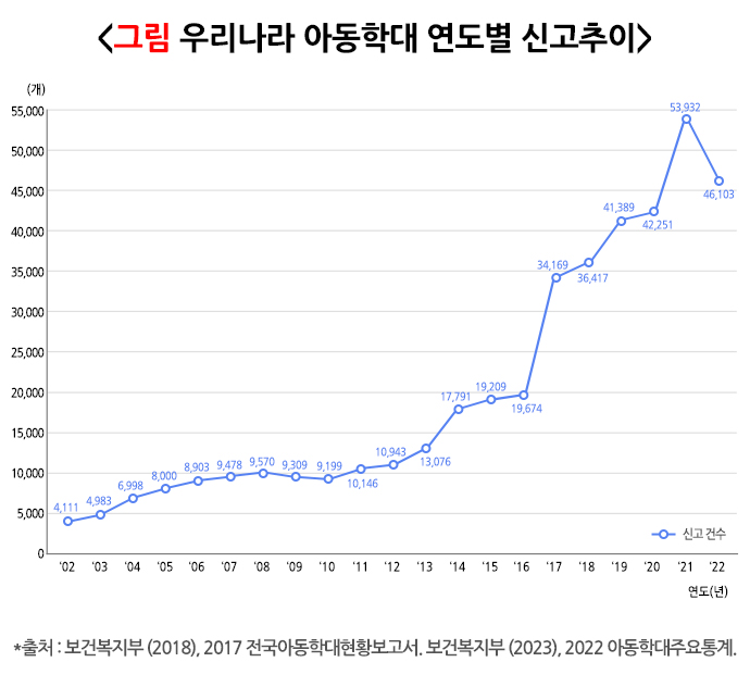 2006년 이후의 아동학대 신고 건수를 살펴보면, 특히 2014년에 '아동학대범죄의 처벌 등에 관한 특례법'이 제정된 이후 신고 건수가 급격히 증가한 것을 알 수 있습니다. 이는 우리나라에서 아동학대가 갑자기 증가했다고 보기보다는, 국민들의 아동학대에 대한 인식과 경각심이 개선됨에 따라 신고가 늘어난 것으로 해석됩니다.