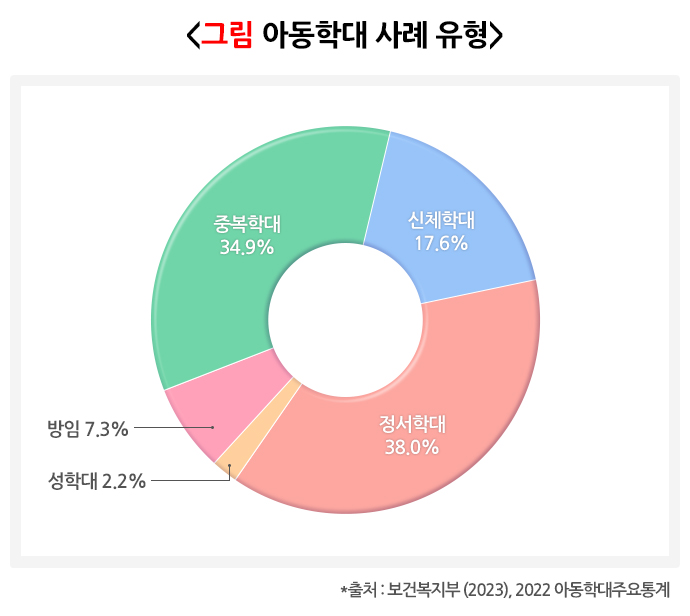아동학대는 신체 학대, 정서 학대, 성 학대, 유기와 방임의 4가지 유형이 있습니다. 이 중에서 두 가지 유형을 동시에 가하는 중복 학대가 가장 많습니다.