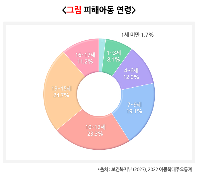 보건복지부에서 발간한 '2022년 아동학대 주요통계'에 따르면, 1세 미만의 어린 아이부터 청소년까지 다양한 연령의 아동이 피해를 당하고 있는 것을 알 수 있습니다. 특히 13~15세(24.7%)가 가장 많았고, 그 다음으로 10~12세(23.3%), 7~9세(19.1%) 순으로 나타났습니다.