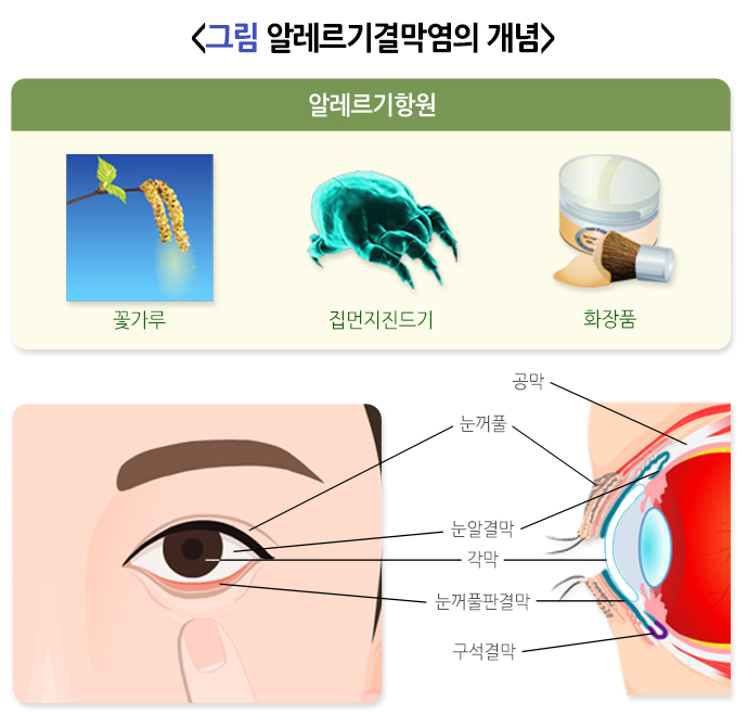 결막은 외부에 노출되어 있기 때문에 먼지, 꽃가루, 약품, 화장품 등 수많은 물질에 의해 염증이 발생할 수 있으며, 외부 물질에 의한 과민반응으로 나타나는 결막염을 알레르기결막염이라고 합니다.