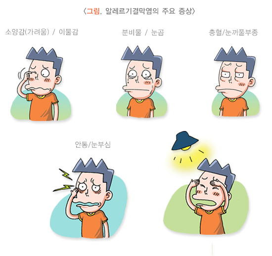 아토피각결막염은 알레르기결막염의 주요 증상과 함께 눈 주위 피부가 거칠어지고 종종 붉어지고 갈라집니다. 두 질환 모두 각막에 반복되는 상처, 신생혈관을 동반한 각막혼탁, 각막궤양 등의 합병증이 생길 수 있는데 심한 경우 영구적으로 시력장애가 남기도 합니다.